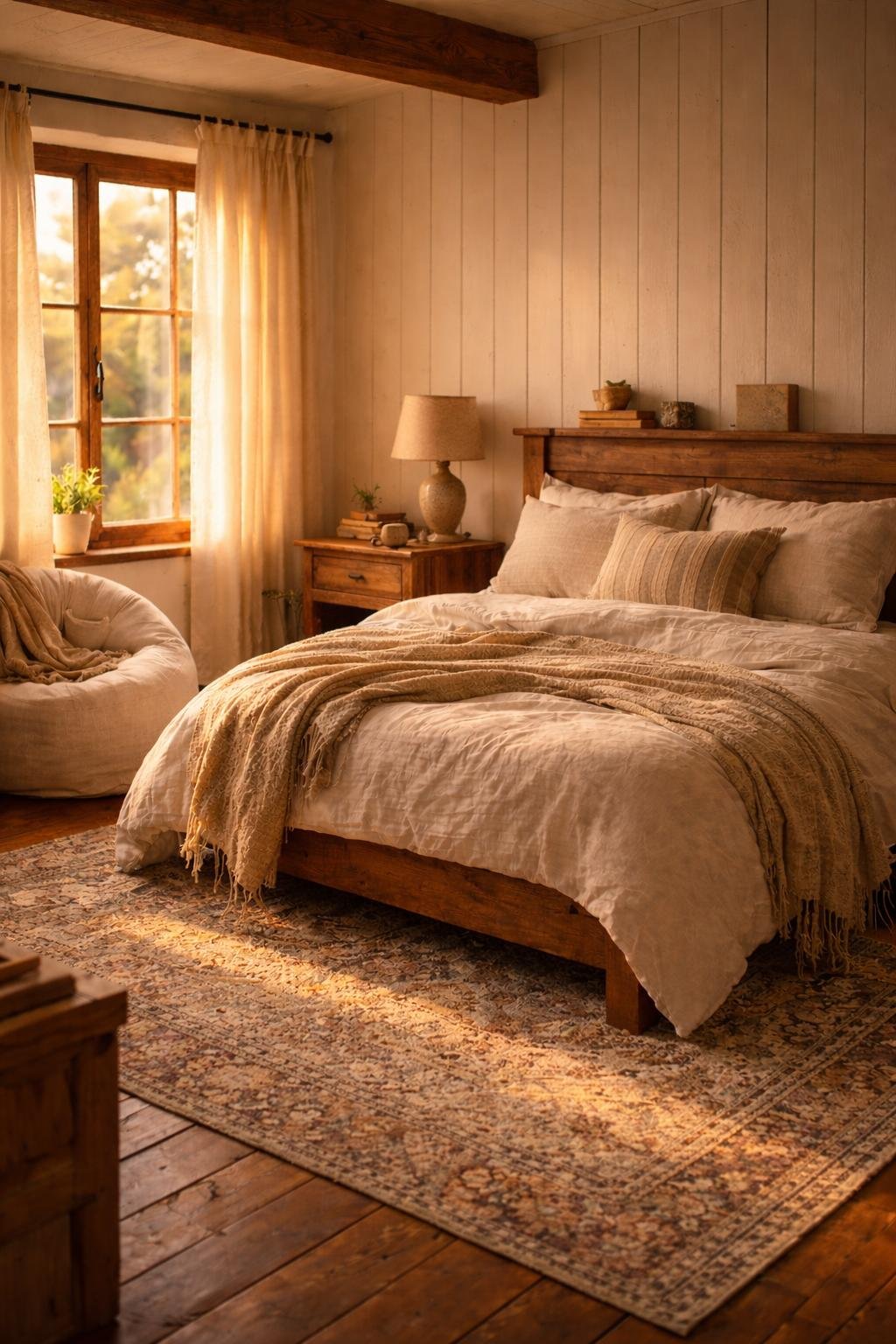 Golden sunlight, soft textures, and warm wooden tones create a cozy bedroom that feels calm, inviting, and naturally beautiful.