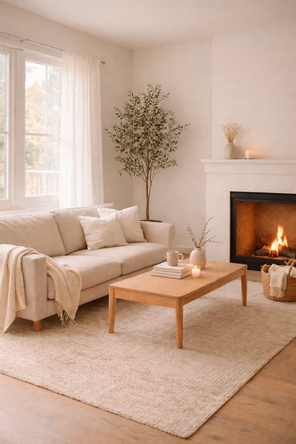 This living room blends warm neutral tones with soft textures to create a calm and inviting atmosphere. The light-toned sofa, layered with cozy cushions and a draped throw, adds a relaxed, lived-in feel. A simple wooden coffee table anchors the space, styled with minimal decor that feels natural and effortless.