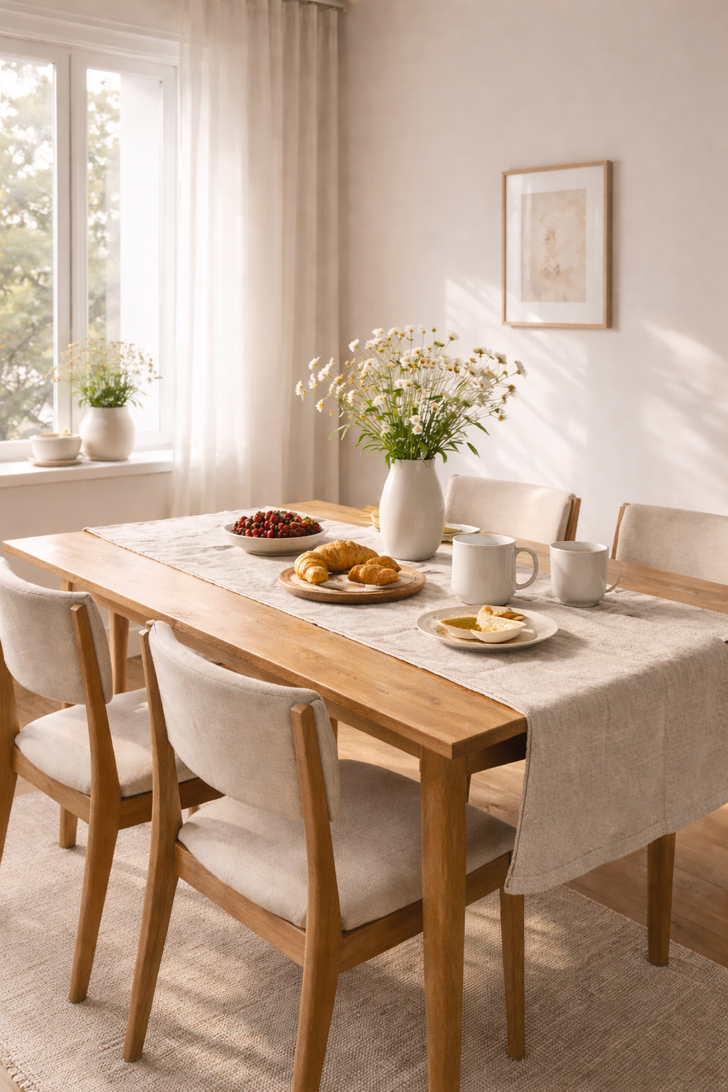 This soft, minimal dining setup is designed for calm mornings and simple everyday moments. Light wood tones, neutral textiles, and natural light create a peaceful and airy feel.